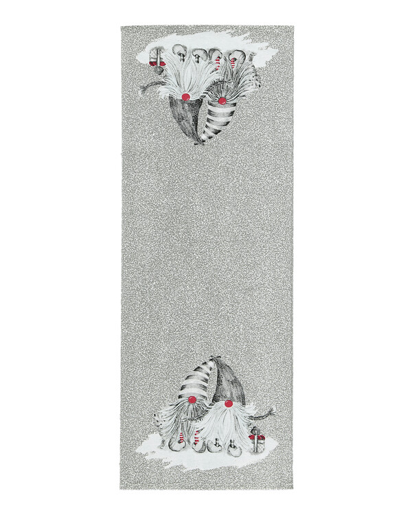 Hieno ja ajaton puuvillakaitaliina. Aiheena koristeelliset tontut, jotka piristävät joulun kattausta. Koko: 35 x 110 cm. Materiaali: 100 % puuvillaa. Pesuohje: 40°. Väri: Harmaa.