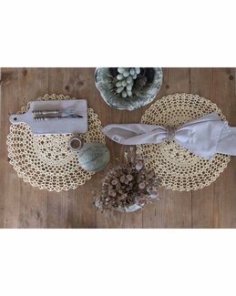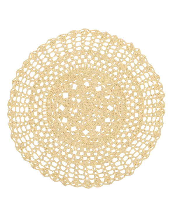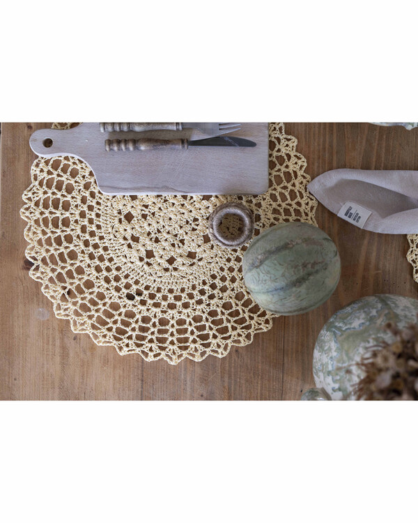 Koristeellinen pyöreä pöytätabletti, joka on käsin virkattu. Hieno virkkaustekniikka luo kuvion yksityiskohtaisilla silmukoillaan, mikä luo käsityön, perinteen ja nostalgian tuntua.