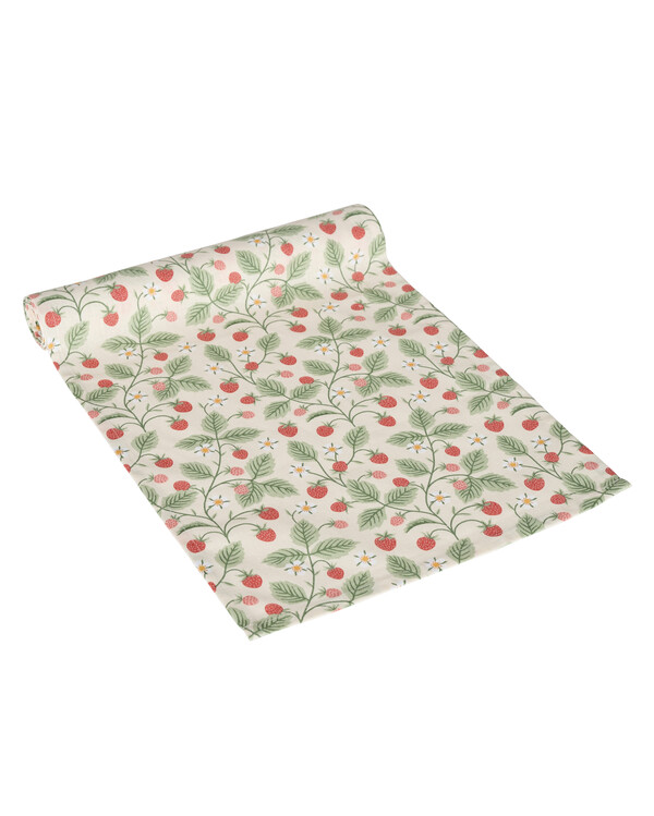 Tuo kesän tunnelmaa pöytään tällä hurmaavalla kaitaliinalla, jossa on mansikkakuvio. Eloisa design punaisine mansikoinee...