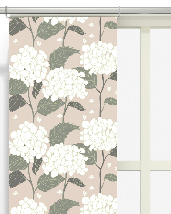 Kauniit paneeliverhot, joiden kuosissa on ihastuttavia vaaleanpunaisia hortensioita, suunnittelijana Linda Svensson Edev...
