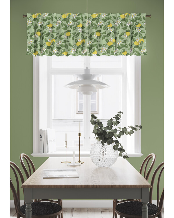 Koristeellinen yhdistelmänauhakappa, joka myydään metreittäin ja jonka kaunis sitruunakuosi tuo huoneeseen kesäistä ja eloisaa tunnelmaa! Suunnittelija on MiaLotta Arvidsson-Mars. Tämä kappaverho tekee tilasta raikkaan ja kutsuvan, päästää valoa juuri sopivasti sisään ja antaa ikkunalle tyylikkään ja persoonallisen ilmeen.