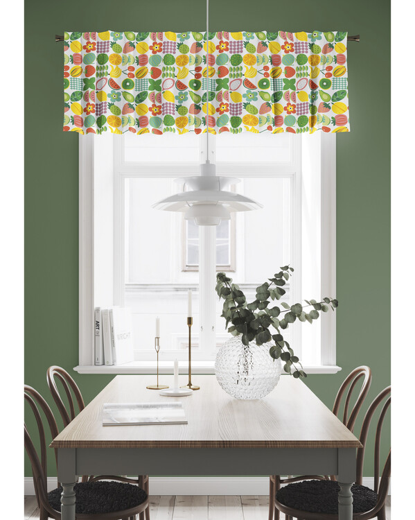 Koristeellinen kappakangas, jossa on yhdistelmänauha ja hedelmäkuosi – täydellinen valinta keittiöön tuomaan raikasta, värikästä ja viihtyisää ilmettä. Kangas luo elävää ja kodikasta tunnelmaa, päästää valoa sisään ja tekee ikkunasta tyylikkään sekä hurmaavan näköisen.