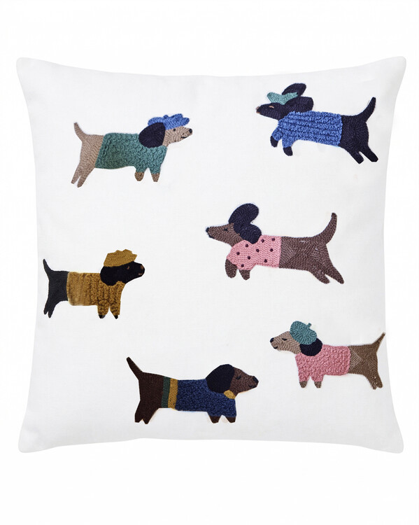 Ihastuttava tyynynpäällinen, jossa koirat poseeraavat upeissa asuissa! Yksityiskohtaiset, brodeeratut koirakuviot pehmeä...