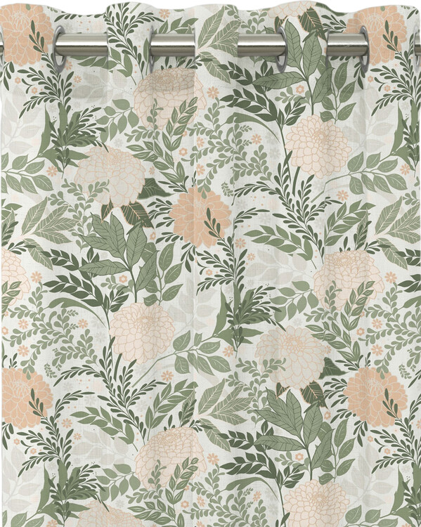 Valmiiksi ommellut rengasverhot, joissa on kauniita kukkia, muun muassa daalioita. Verhot tuovat huoneeseen pehmeää ja elävää tunnelmaa. Kuvio on painettu kaksisuuntaiselle slub-kankaalle, joka luo luonnollisen tekstuurin ja tyylikkään ilmeen. Helppo pujottaa verhotankoon – nopea tapa luoda kodikas ja tyylikäs tunnelma kotiin.