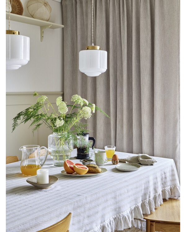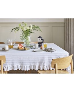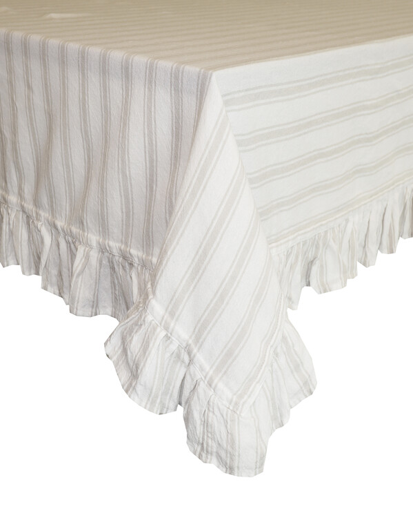 Luo pöytään viehättävää maalaisromanttista tunnelmaa Madicken-pöytäliinalla. Siinä on klassiset raidat, ja kauniit röyhelöt reunoissa tuovat pehmeää ja romanttista ilmettä. Täydellinen sekä arkeen että juhlaan.