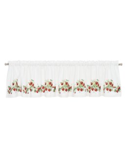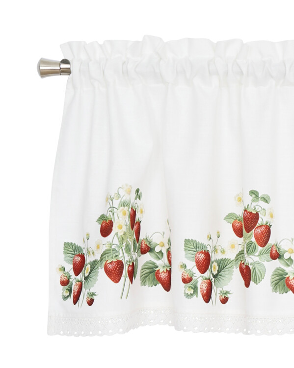 Ihana verhokappa, jossa on painettu mansikkakuvio kauniissa väreissä – täydellinen luomaan kesäistä ja leikkisää tunnelmaa huoneeseen. Koristeellinen pitsi alareunassa lisää viehättävän, maalaismaisen säväyksen.