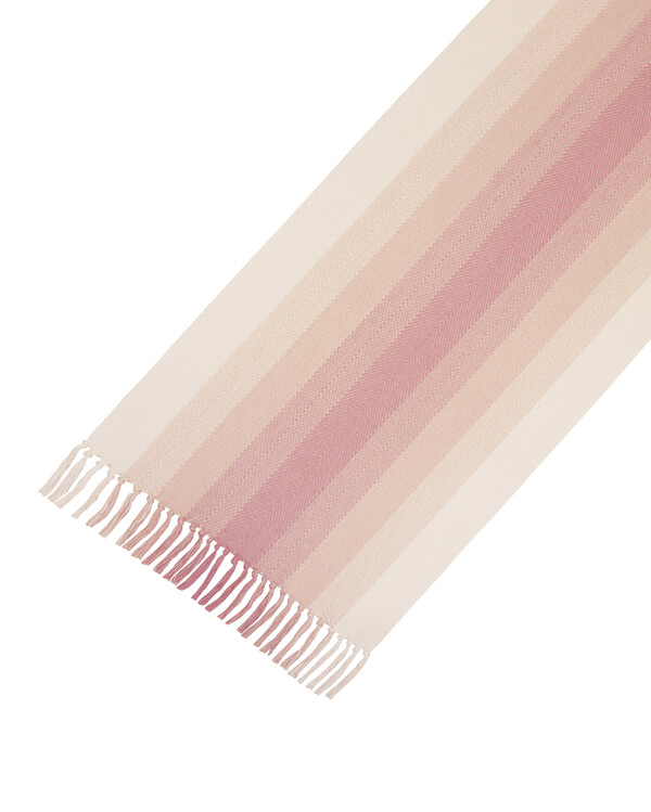Kaunis kaitaliina, jossa on hapsut. Keskellä oleva vahva väri muuttuu pehmeästi reunoja kohden vaaleampaan sävyyn päättyen tyylikkäisiin valkoisiin reunoihin. Tyylikäs ja harmoninen yksityiskohta, joka tuo pöytään eloa.