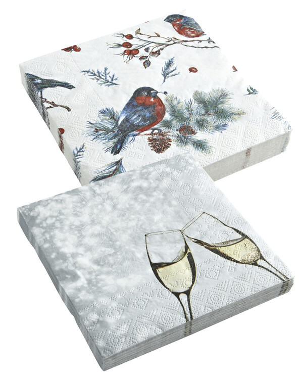 Koristeelliset servetit joulun ja uudenvuoden kattauksiin. Kaksi eri aihetta, kummassakin