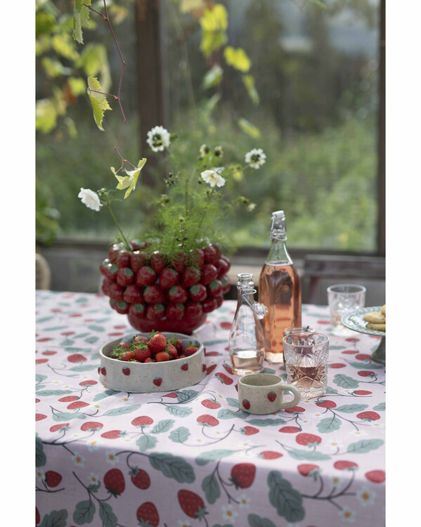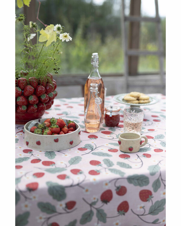 Luo pöytään leikkisä ja kesäinen tunnelma tällä pöytäliinalla, jossa on mansikkakuvio vaaleanpunaisella taustalla. Täydellinen lämpimiin päiviin, ulkokahvihetkiin tai kesän päivällisille. Sopii mainiosti sekä arkeen että juhlavampiin tilaisuuksiin.